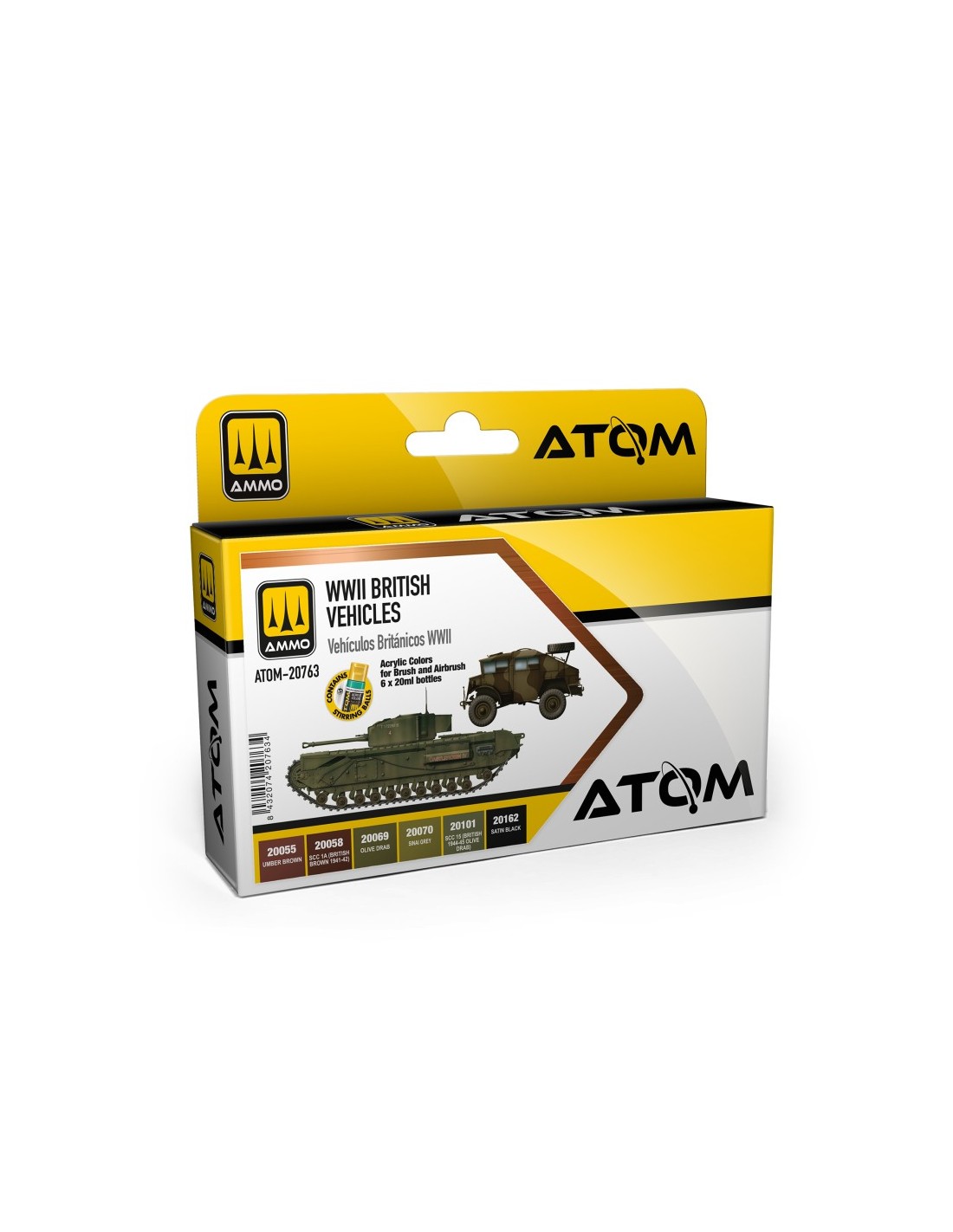 Contiene seis colores acrílicos de alta calidad especialmente pensados para pintar vehículos británicos del Frente Europeo (ETO) entre 1939 y 1945. Desde un Matilda Mk. I hasta un Sherman Firefly de finales de la guerra, entre otros muchos vehículos blindados, así como coches y camiones.