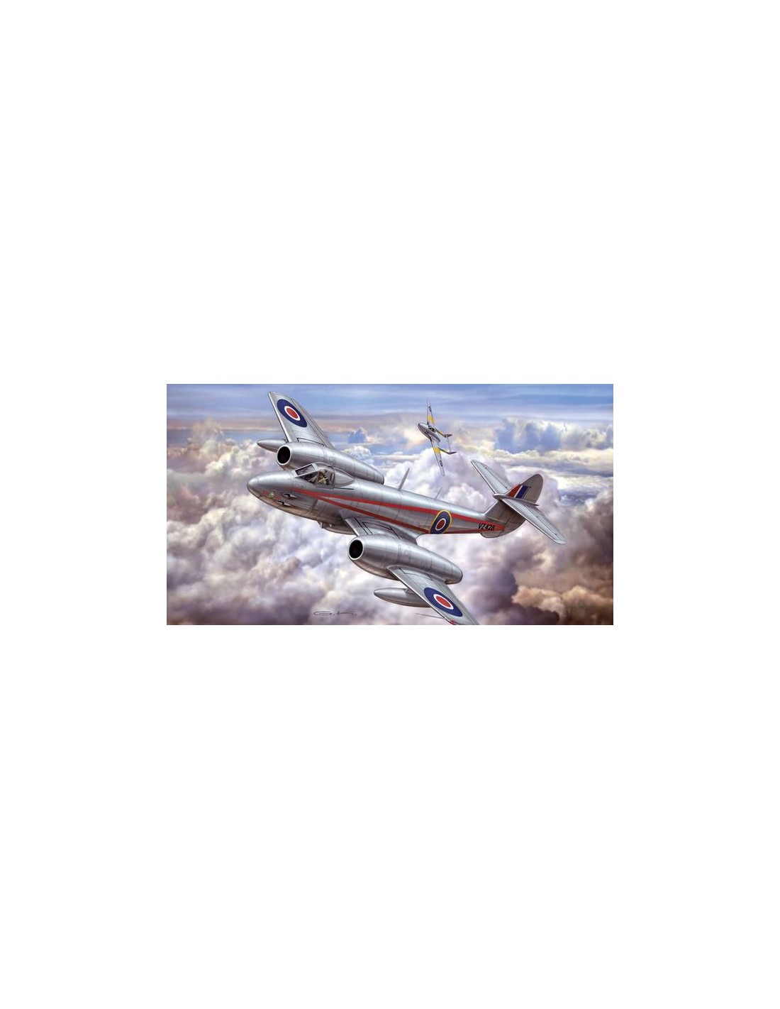 El Gloster Meteor es un avión de combate británico monoplaza, bimotor y totalmente metálico de finales de la Segunda Guerra Mundial. El vuelo del prototipo tuvo lugar el 5 de marzo de 1943 y la máquina comenzó a llegar a las unidades lineales en el verano de 1944. El escuadrón 616 de la RAF fue el primero en recibir aviones. George Carter estuvo a cargo de todo el proyecto. Los prototipos usaban el motor de Havilland Halford H.1, pero el avión de la serie usaba motores Rolls-Royce Derwent I. El Meteor fue el primer avión de combate aliado producido en masa y el segundo en el mundo, después del Me262. Durante la Segunda Guerra Mundial, se utilizó principalmente para combatir las bombas voladoras V1. Vale la pena señalar que en el transcurso de las hostilidades, nunca hubo una sola pelea aérea entre un Meteor y ningún avión alemán, a pesar de que en tierra la compañía Gloster aniquiló alrededor de 40 máquinas enemigas. El avión también fue muy utilizado después de 1945, especialmente por las tropas australianas durante la Guerra de Corea. En total, se crearon una docena de versiones de esta máquina, las más producidas son: F.3 y F.4 (versiones cazabombardero de la Segunda Guerra Mundial), T.7 (versión de entrenamiento para dos personas , creado en 1948), F. 8 (versión mejorada del F.4, en servicio desde 1950). Datos técnicos: longitud: 13,59m, envergadura: 11,32m, altura: 3,96m, velocidad máxima: 965km/h, velocidad de ascenso: 35,6m/s, alcance máximo: 965km, techo máximo 13.100m, armamento: permanente - 4 Hispano de 20mm cañones, honda: hasta 908 kg de bombas o cohetes no guiados.