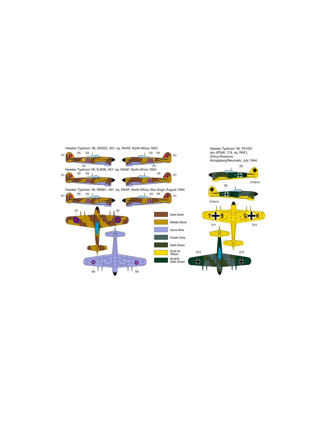 El Hawker Typhoon es un avión de combate británico, de un solo asiento, de un solo motor, de metal, semi-caparazón de ataque en la estructura de ala baja de la Segunda Guerra Mundial. Diseñado de acuerdo con los requisitos establecidos por el Ministerio de Defensa británico en la especificación F.18 / 37 de 1937, por el famoso diseñador Sydney Camm. El vuelo del prototipo tuvo lugar el 24 de febrero de 1940 y la máquina entró en producción en masa en 1941. Los aviones estaban propulsados por tres variantes del motor Napier Sabre Mk.II, que iban desde 2180KM a 2260KM. Había cinco versiones de este avión. Los dos primeros son los cazas F.Mk.IA y F.Mk.Ib, que se diferencian principalmente en el armamento de a bordo AI Mk.IV y Hawker Typhoon FR Mk IB radar fighter - versión de reconocimiento. Habiendo lidiado con los problemas iniciales de diseño, especialmente los defectos del motor, el Hawker Typhoon también tuvo un gran éxito contra los proyectiles V1 y los tanques alemanes durante los combates en Normandía. En total, se construyeron más de 3.300 ejemplares. Datos técnicos (versión Typhoon F.Mk.IB): longitud: 9,73 m, envergadura: 12,67 m, altura: 4,66 m, velocidad máxima: 663 km/h, velocidad de ascenso: 13,59 m/s, alcance máximo: 821 km, máximo techo 10700 m, armamento: fijo - 4 cañones Hispano Mk.II 20mm, suspendido - hasta 908 kg de bombas, 8 misiles RP-3.
