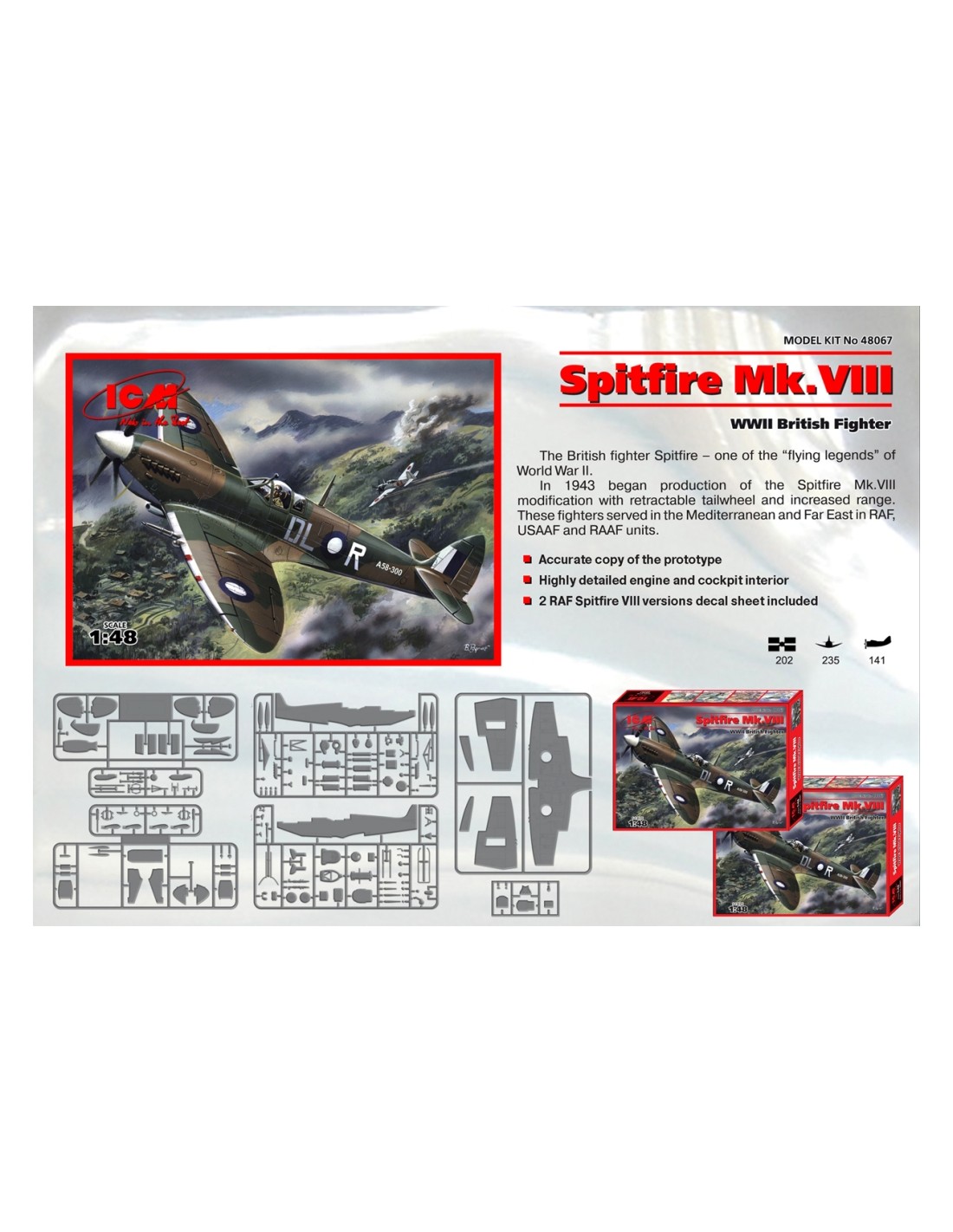 Supermarine Spitfire es probablemente el caza británico más famoso de la Segunda Guerra Mundial. Era una máquina totalmente metálica con una configuración de ala baja, características alas elípticas, una cola clásica y un tren de aterrizaje retráctil. El vuelo del prototipo tuvo lugar el 5 de marzo de 1936. El Spitfire resultó ser el elemento básico de la guerra de la RAF, y continuó funcionando bien después de la guerra, permaneciendo en producción durante 10 años. La historia del Spitfire comenzó en el escritorio de dibujo de RJ Mitchell, diseñador principal de Supermarine. Las primeras máquinas fueron a las unidades de la RAF en 1938, pero cuando comenzó la Batalla de Gran Bretaña en el verano de 1940, ya había 19 escuadrones de cazas modernos en los aeródromos, junto con los huracanes de las islas un poco más antiguos, 600 aviones estaban defendiendo. Con la expansión de las hostilidades, el Spitfire sirvió dondequiera que la RAF operara en el Lejano Oriente, África del Norte e Italia, durante el desembarco de Normandía y los combates en Francia, y finalmente durante la operación en Alemania en 1945. Para muchos británicos, se convirtió en un símbolo de victoria en la Segunda Guerra Mundial. Esta maravillosa máquina tiene al menos una docena de versiones de producción. Los más importantes de ellos son, entre otros el primer Spitfire Mk.I de producción masiva propulsado por un motor Rolls-Royce Merlin II de 1030 hp. Fue sobre todo esta máquina la que hizo una contribución tan excelente a la Batalla de Gran Bretaña. Se han desarrollado muchas versiones de este modelo, incluyendo PR Mk IA (versión de reconocimiento) o PR.IG (versión de reconocimiento armada). Otra versión interesante fue el Spitfire Mk.V con motor Rolls-Royce Merlin 45 de 1440HP. Posteriormente, también se ensamblaron los motores Merlin 50. La producción en serie de esta versión comenzó en 1941 y fue la respuesta de la RAF a la aparición del Messerschmitt Bf-109F. Otra versión muy exitosa es el Spitfire Mk.IX, propulsado por un motor Merlin 61 con hélice de 4 palas. Fue creado como oponente al Focke-Wulf Fw-190 y se puso en producción a finales de 1941. Esta versión fue modificada muchas veces y, por ejemplo, en 1944 obtuvo una nueva mira giroscópica, un timón más grande o un sistema de alas diferente. Otra versión importante es el Spitfire Mk.XIV con un motor Rolls-Royce Griffon 61 y una hélice de cinco palas. La producción en serie comenzó en octubre de 1943. Una de las últimas series producidas fue la versión Mk.21. Esta versión tenía un motor Griffon 61, una estructura y revestimiento fuertemente reforzados, las alas estaban extendidas, aumentando su superficie de vuelo. La producción en masa comenzó en marzo de 1945. Datos técnicos (versión Mk.XIV): longitud: 9,14 m, envergadura: 11,23 m, altura: 3,05 m, velocidad máxima: 717 km/h, velocidad de ascenso: 18,5 m/s, techo práctico: 13.200 m, alcance máximo: 1815 km, armamento: fijo - 4 ametralladoras de 7,7 mm y 2 cañones Hispano Mk II de 20 mm, suspendido - hasta 225 kg de bombas.
