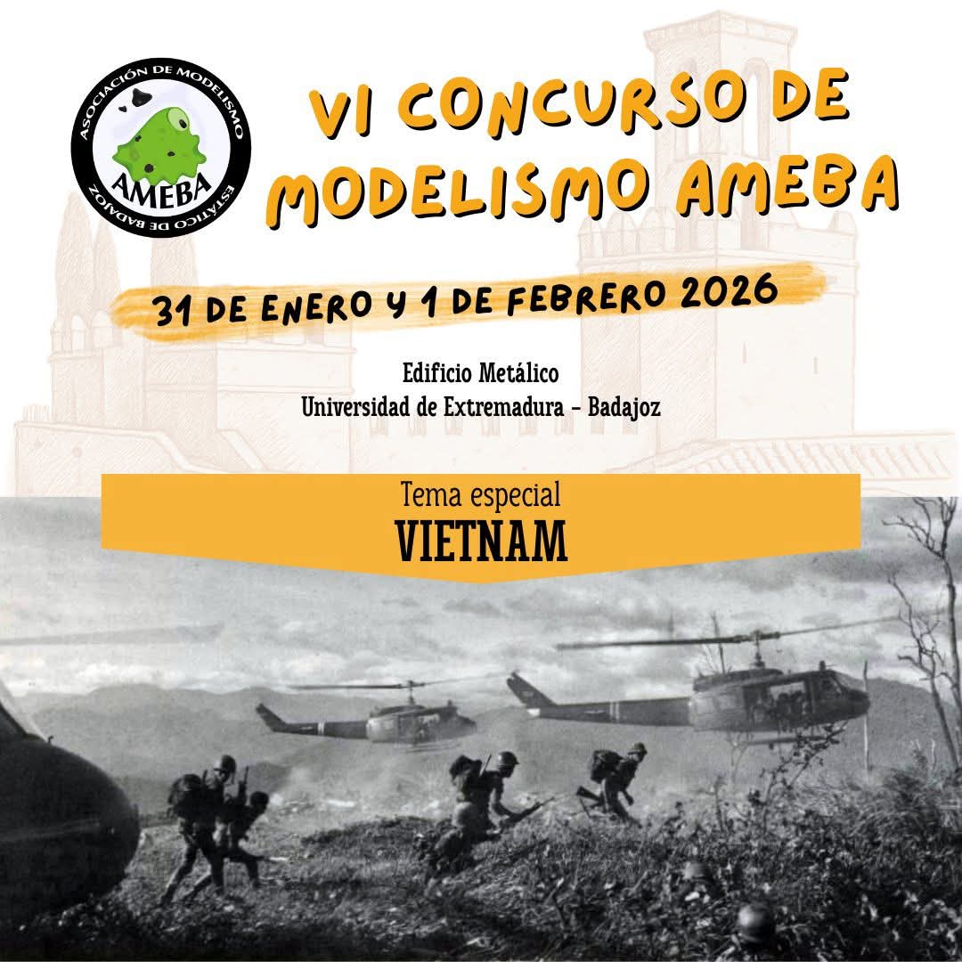 El día 31 de enero y el 1 de febrero estaremos en el VI Concurso de Modelismo Ameba, en el Edificio Metálico, Universidad de Extremadura, Badajoz. Recordad que el tema especial de este año es Vietnam. ¡Allí nos vemos!