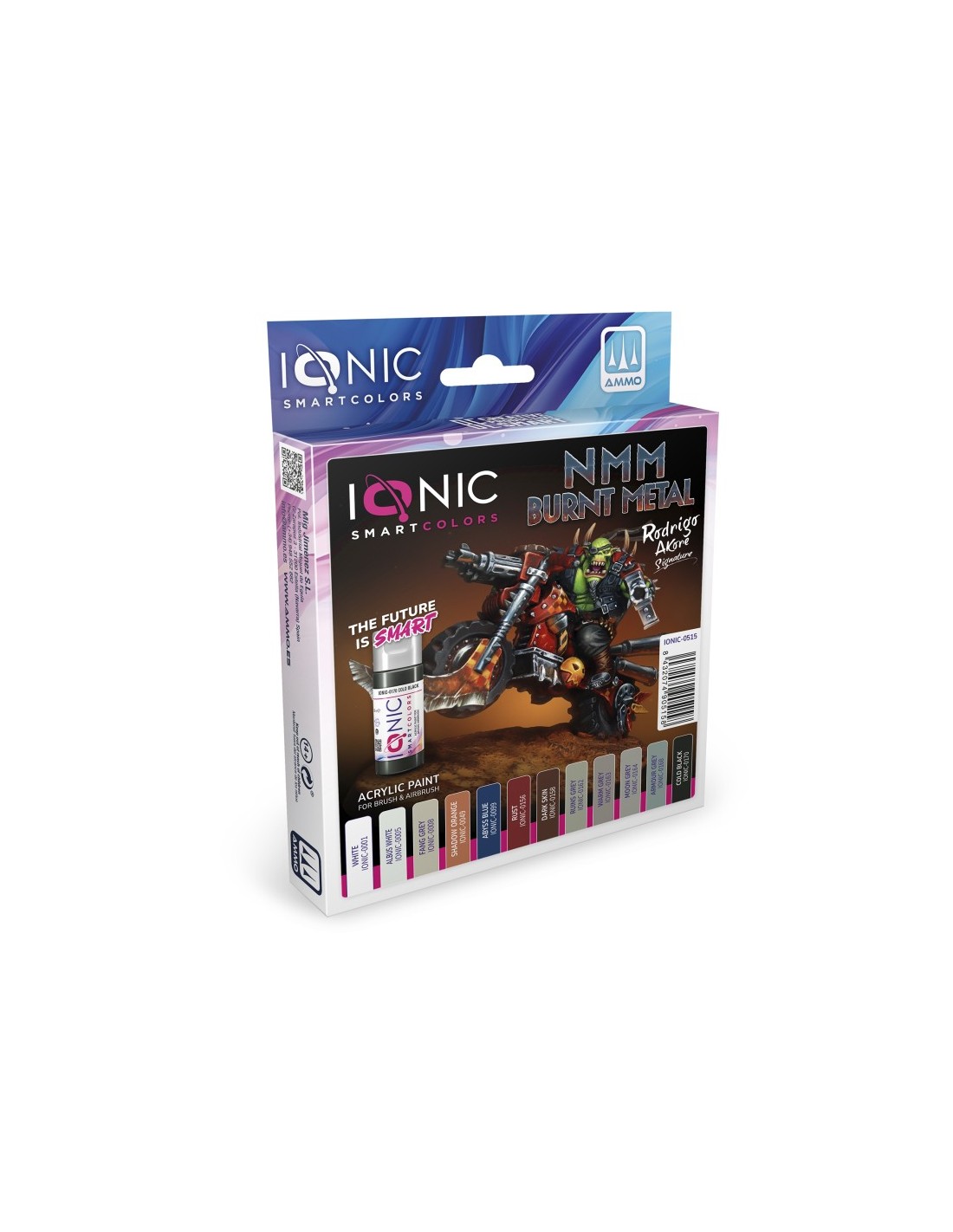 Este set de Ionic Smart Colors incluye 12 colores acrílicos, especialmente diseñados para proporcionar los tonos esenciales para pintar metales quemados con la técnica Metal No Metálico (NMM) en miniaturas de fantasía, ciencia ficción y temas históricos.