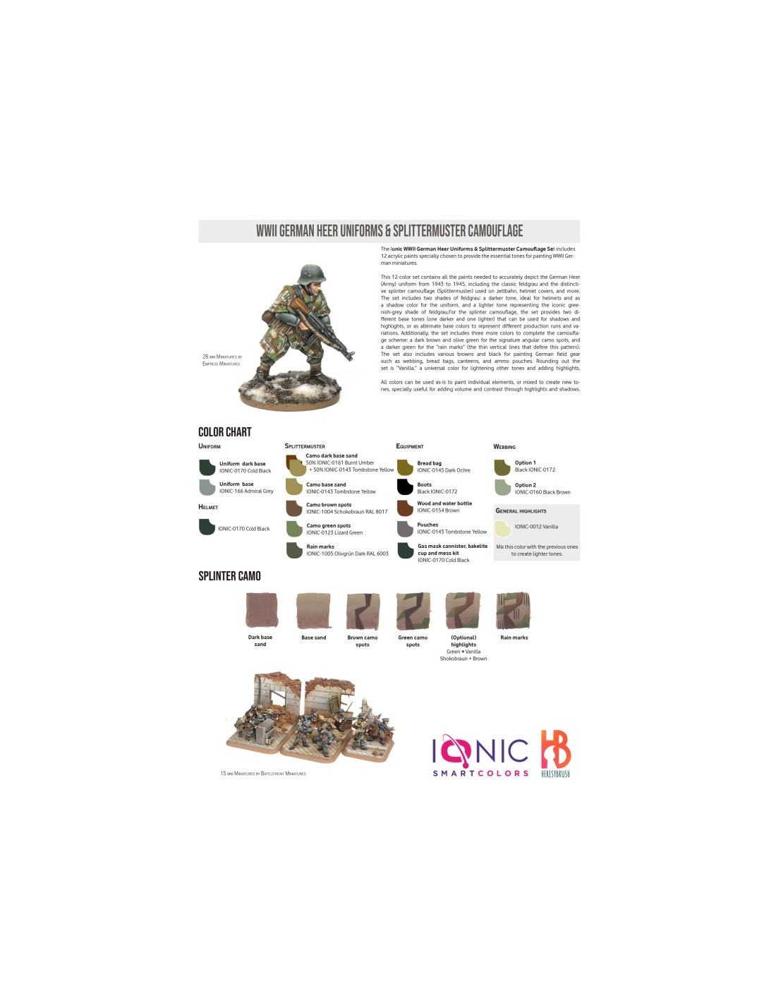 Este set de 12 pinturas contiene todos los colores necesarios para pintar el uniforme alemán de 1943-1945, incluyendo el clásico feldgreu y el camuflaje astillado o splittermuster utilizado por el Heer en la tienda de campaña/poncho, además de utilizarse para las fundas miméticas de lo cascos. El set incluye dos tonos de feldgreu, uno oscuro e ideal para el casco además de poderse usar para crear las sombras en el uniforme, y otro más claro y representativo del mítico color gris verdoso del uniforme alemán. Para el camuflaje de astillas, el set incluye dos tonos diferentes como base, uno más oscuro y otro más claro, que se pueden utilizar como sombra y luz respectivamente; o como dos colores base distinto (hubo diferentes versiones del camuflaje). Además, el set incluye otros tres colores para definir el camuflaje, incluyendo marrón oscuro y verde oliva para pintar las manchas de camuflaje angulosas, y un verde oscuro para las "gotas de lluvias" o delgadas líneas verticales que caracterizan este camuflaje. El set se completa con varios tonos marrones y negro para pintar el equipo del soldado alemán, incluyendo los correajes, bolsa para el pan, cantimplora y cartucheras. Finalmente, se incluye un color universal para crear tonos más claros y aplicar luces, Vainilla. Aunque todos estos colores se pueden utilizar como tal para pintar cada elemento de la figura, también se pueden combinar para crear nuevos colores o tonos, especialmente para generar volúmenes jugando con luces y sombras.