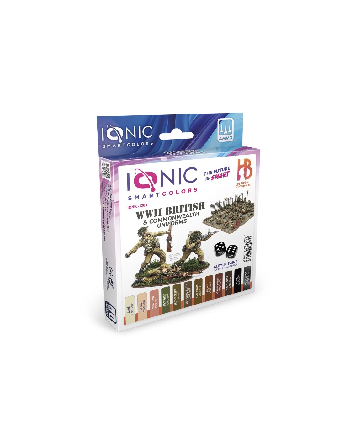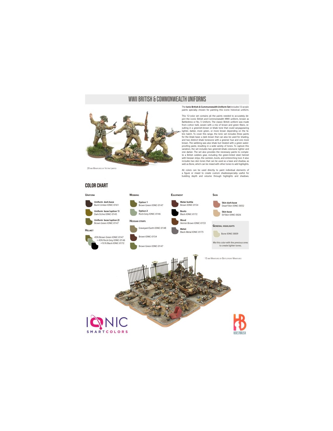 Este set de 12 pinturas contiene todos los colores necesarios para pintar el uniforme del ejército británico y de la Commonwealth denominado "Battledress" o "No. 5 uniform", utilizado en los teatros de guerra de clima templado. El clásico uniforme británico estaba hecho de tela de sarga hecha de algodón, con una combinación de fibras marrones y verdes, resultando en un color marrón verdoso o caqui que podía variar entre tonos más claros, tonos más oscuros, más verdoso o más marrones. Para cubrir toda esta variedad, el set incluye tres pinturas para pintar el color caqui, un marrón oscuro que también sirve para crear sombras, y dos tonos caqui que podemos usar como base, uno más verde y otro más marrón. Los correajes también eran de color caqui, pero se les aplicaba una pasta para hacerlos impermeables de color verde, resultando en una miríada de tonos. Para representar esta otra variación, el set incluye dos tonos de caqui verdoso, uno más claro y otro más oscuro. El set también incluye las pinturas necesarias para pintar el equipo del soldado británico, incluyendo el casco de acero de color verdoso con tiras de arpillera, la cantimplora, botas y pala. El set se completa con dos tonos para pintar piel, que bien se pueden usar como sombra y base, además de un color universal para crear tonos más claros y aplicar luces, Vainilla. Aunque todos estos colores se pueden utilizar como tal para pintar cada elemento de la figura, también se pueden combinar para crear nuevos colores o tonos, especialmente para generar volúmenes jugando con luces y sombras.