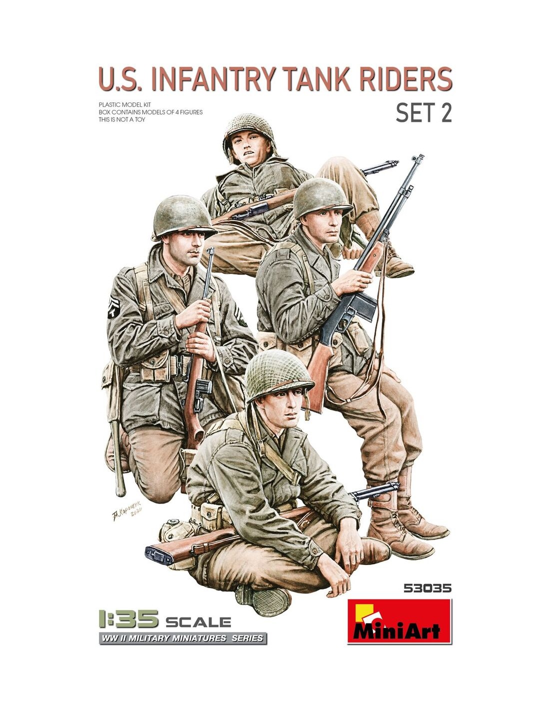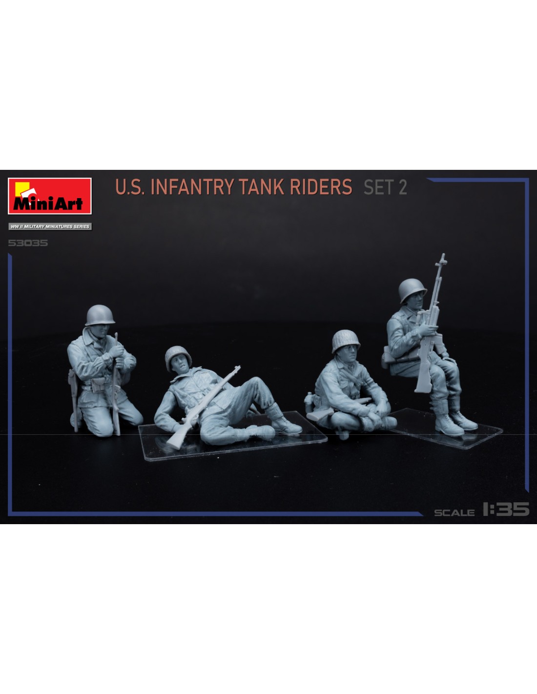 Highly detailed figures depicting U.S. infantry tank riders in relaxed poses. Perfect for bringing your WWII dioramas or vehicle displays to life. • Highly detailed plastic figures of U.S. tank riders